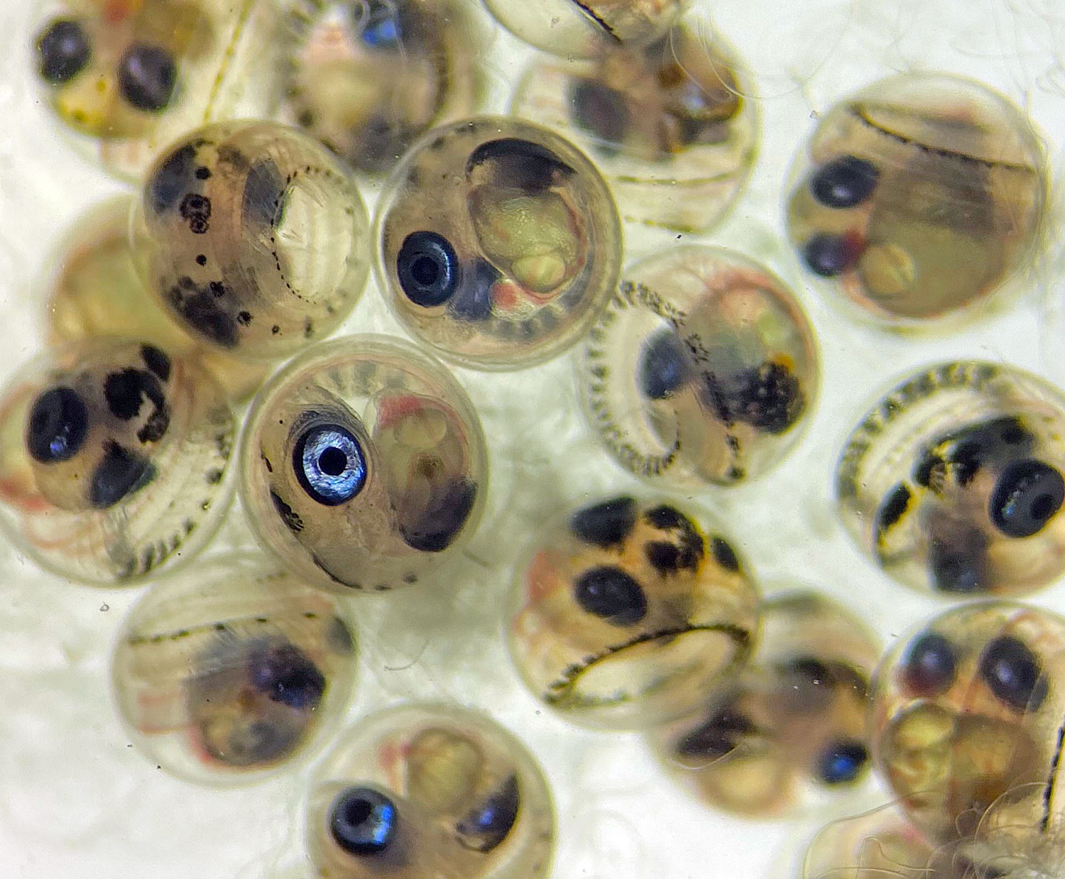 A Chilean silverside embryo of a few days post fertilization. Eyes beginning to pigment and a prominent yolk artery provides nutrients for growth